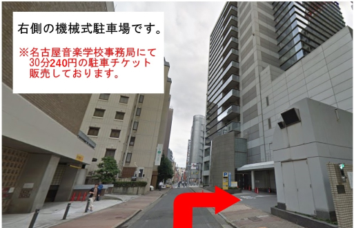 ※ 当校が入る「スカイオアシス栄」ビルの地下駐車場です。機械式で地下2階まで降りていただき入庫となります(当校は地下1階です)。台数に限りがありますため、満車の場合はご了承ください。入口は一方通行となりますため、錦通りの栄公園東 交差点(中電ホールさんと大塚家具さんが面するところ)から南進ください。