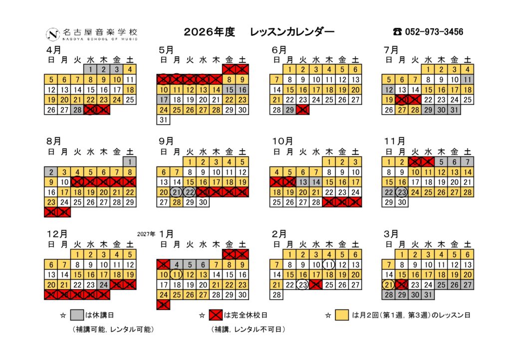 2026年度(2026年4月~2027年3月)のレッスンカレンダーを公開いたしました。